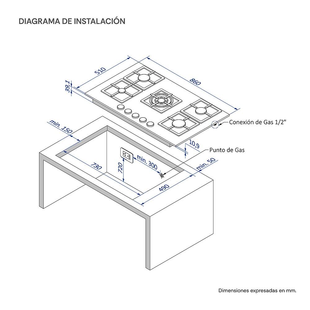 • Quemadores: 5 (1 pequeño, 2 medianos, 1 grande y 1 triple flama)